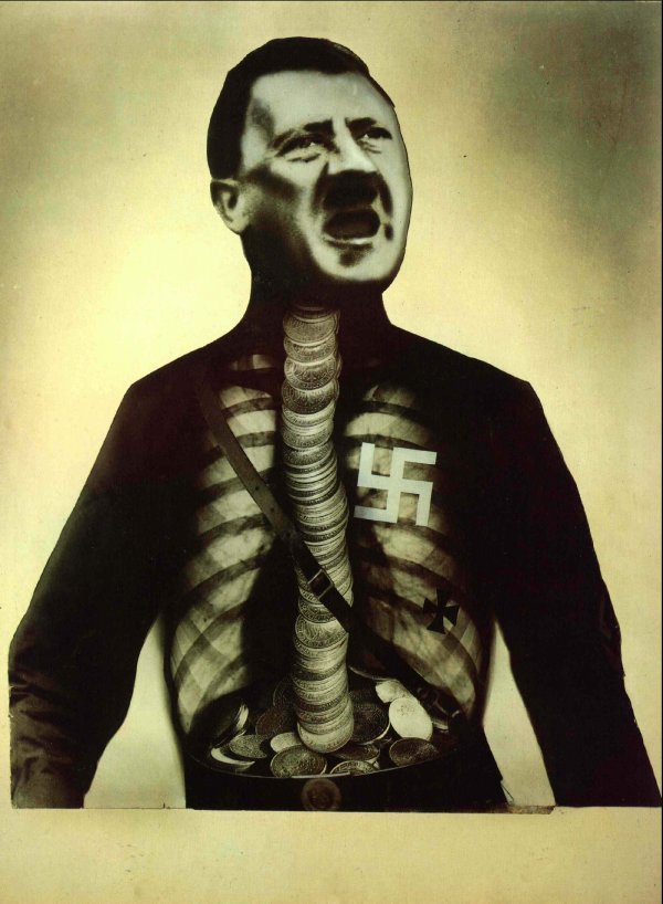 All during the rise of the euro-fascist movements in the 1920s and 1930s, the left dissed & dismissed them as pawns of the capitalist class. Whether in the brilliant German Communist photomontage posters of Heartfield or the pronouncement from Moscow that “fascism is the terroristic dictatorship of the big bourgeoisie,” there was a constant message that Italian fascism and German Nazism were only lifeless puppets for the big capitalist class. This was fatally off center and produced an actually disarming picture.